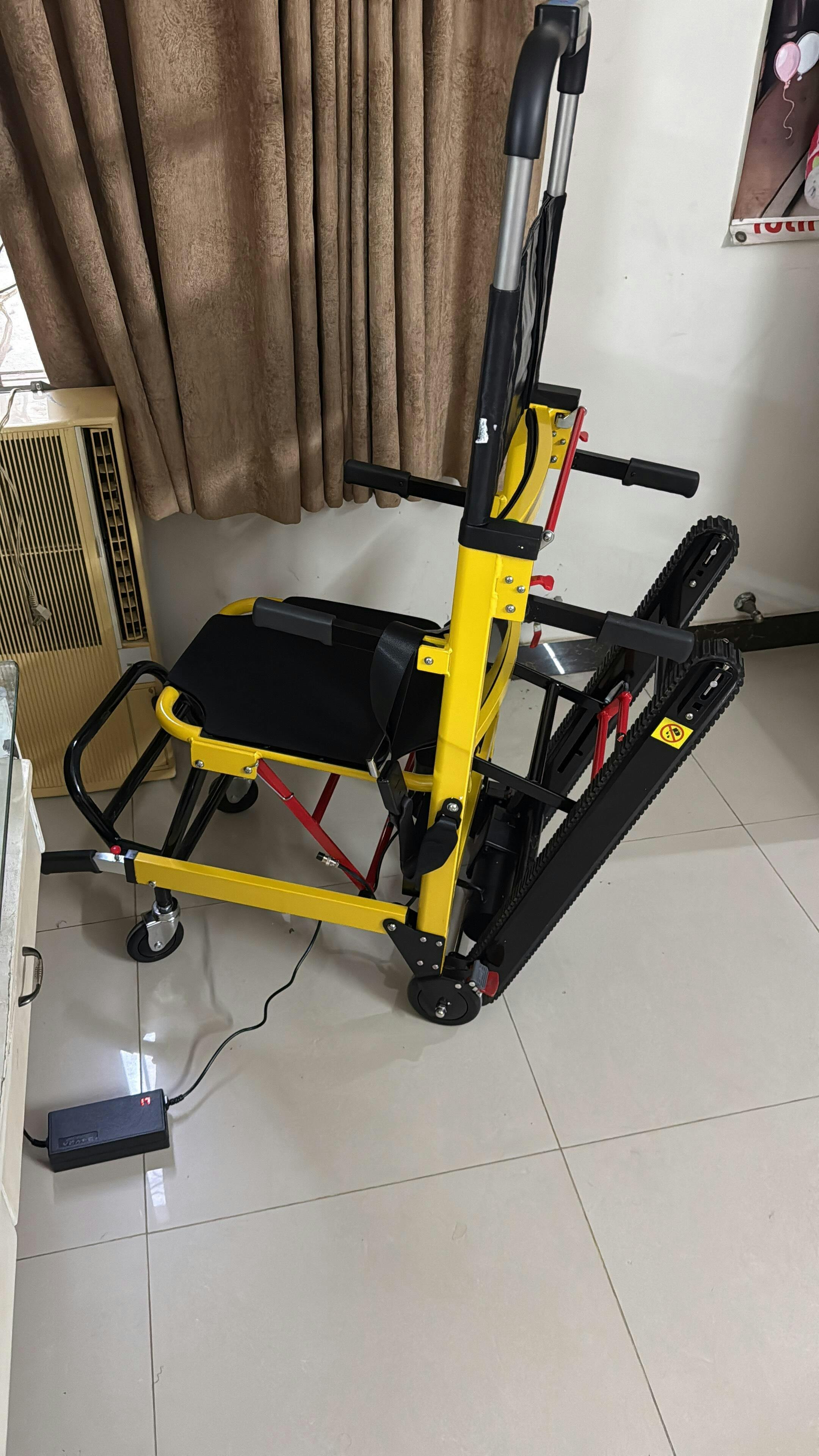 Key highlights include the ability to climb stairs safely and stop securely without sliding or slipping. It can also function as a regular ground wheelchair when stairs are not involved. Thanks to folding capability and compact design, it’s easy to store and transport in vehicles, ambulances, or home closets. The chair supports heavy loads (up to 200 kg), making it suitable for a wide range of users.